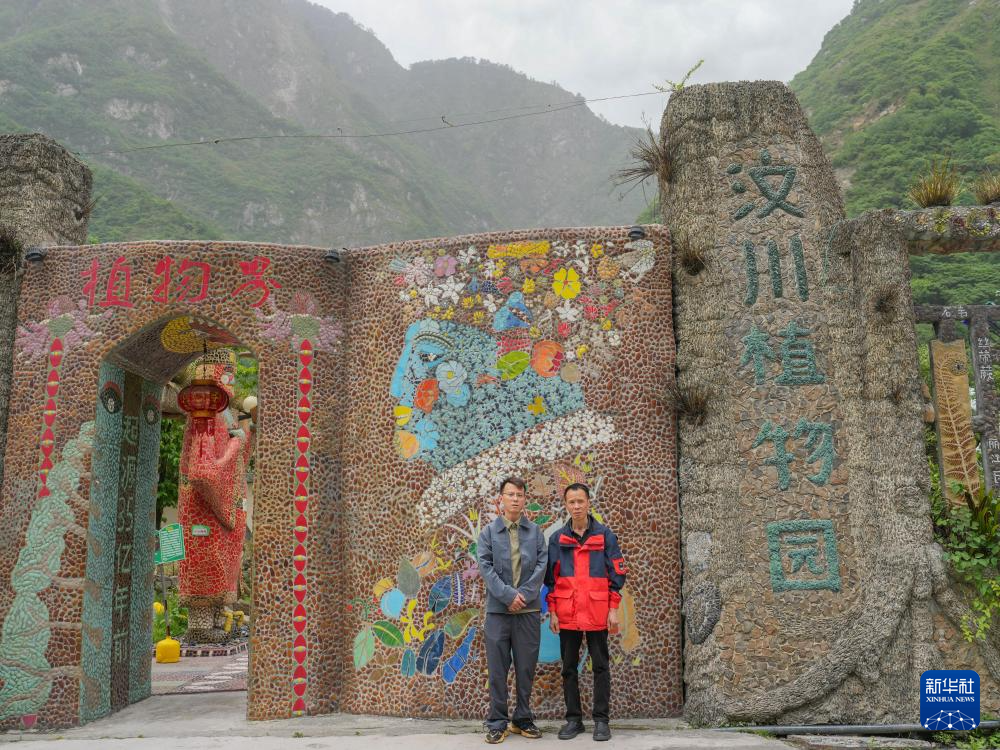 在四川省汶川县映秀镇一碗水村,刘先友(右)和刘明父子在植物园大门前留影(5月9日摄)。