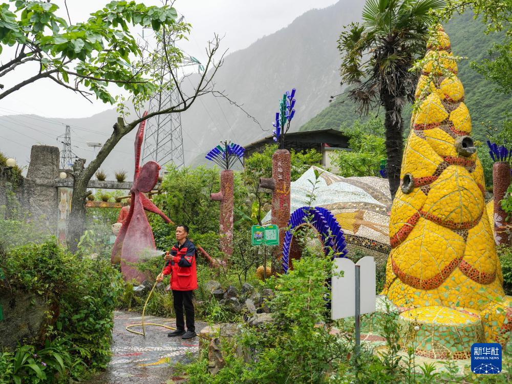 在四川省汶川县映秀镇一碗水村,刘先友给植物浇水(5月9日摄)。