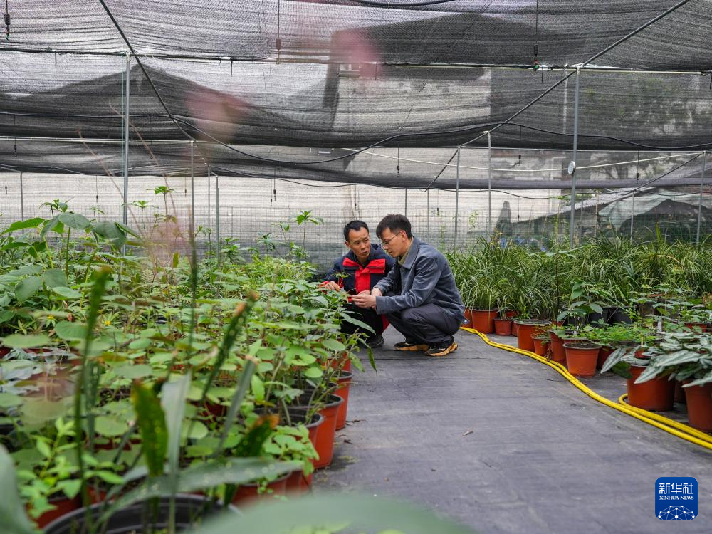 在四川省汶川县映秀镇一碗水村,刘先友(左)和儿子刘明在植物园的保育棚交流(5月9日摄)。