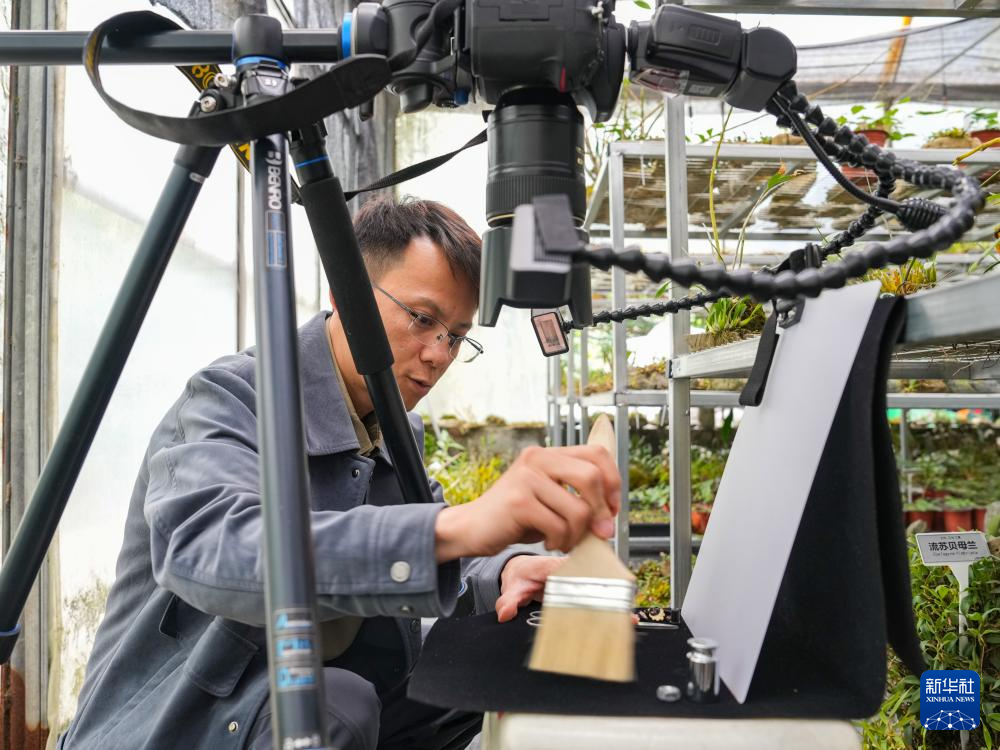 在四川省汶川县映秀镇一碗水村,刘明在植物园的保育棚为拍摄植物精细解剖照做准备(5月9日摄)。