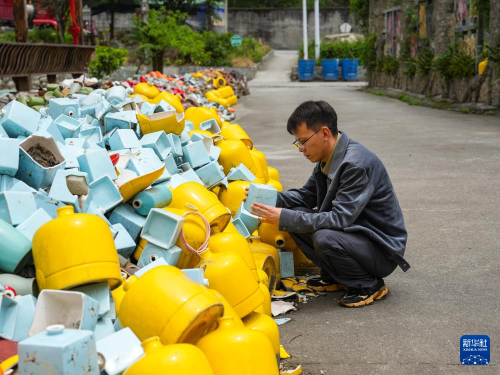 在四川省汶川县映秀镇一碗水村,刘明在植物园外挑选酒瓶碎片(5月9日摄)。
