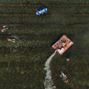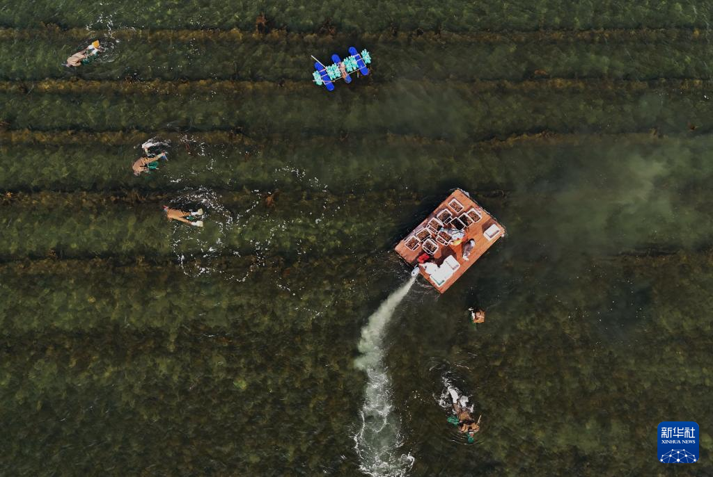 5月12日,河北省昌黎县茹荷镇一家海参养殖合作社的工人在捕捞海参(无人机照片)。