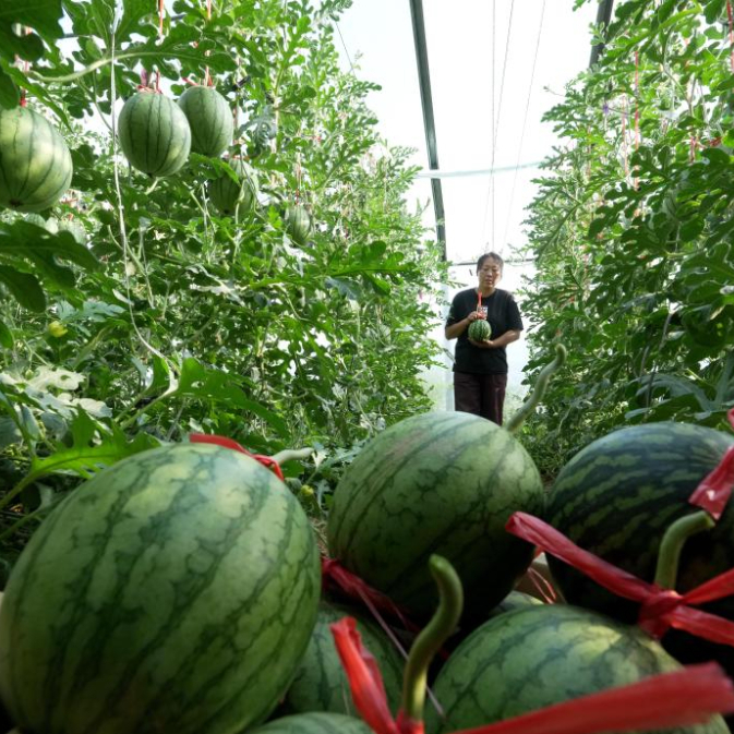 5月11日,河北省卢龙县印庄镇农民在大棚内管护吊蔓西瓜。