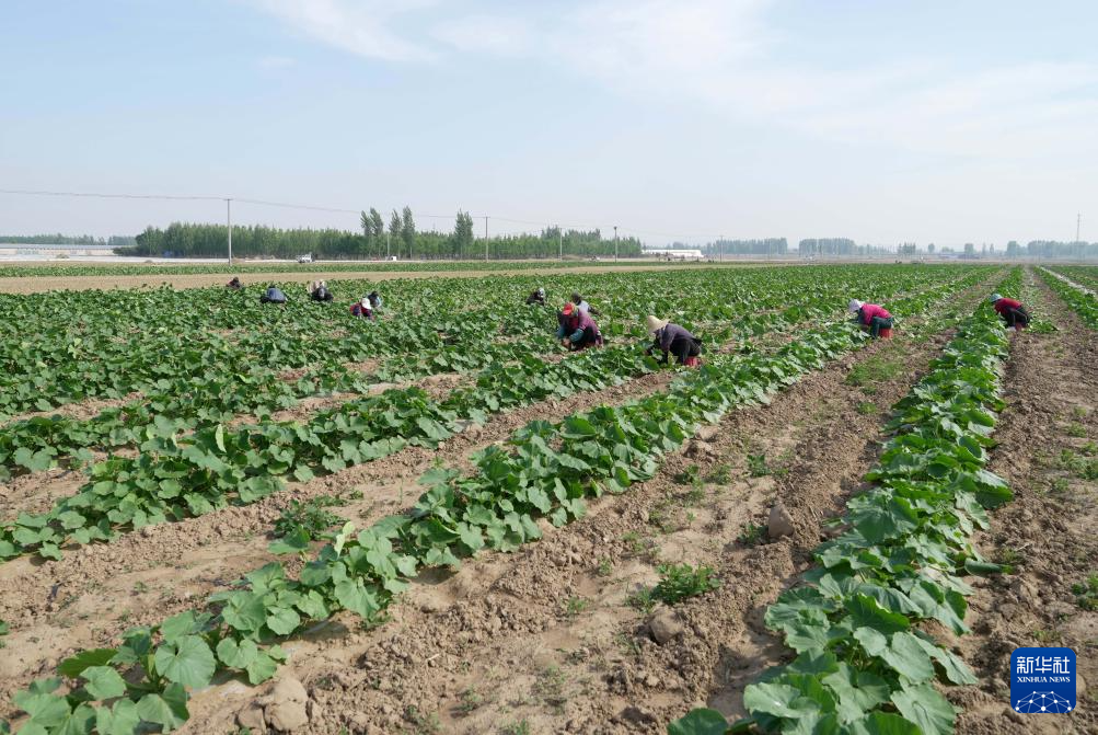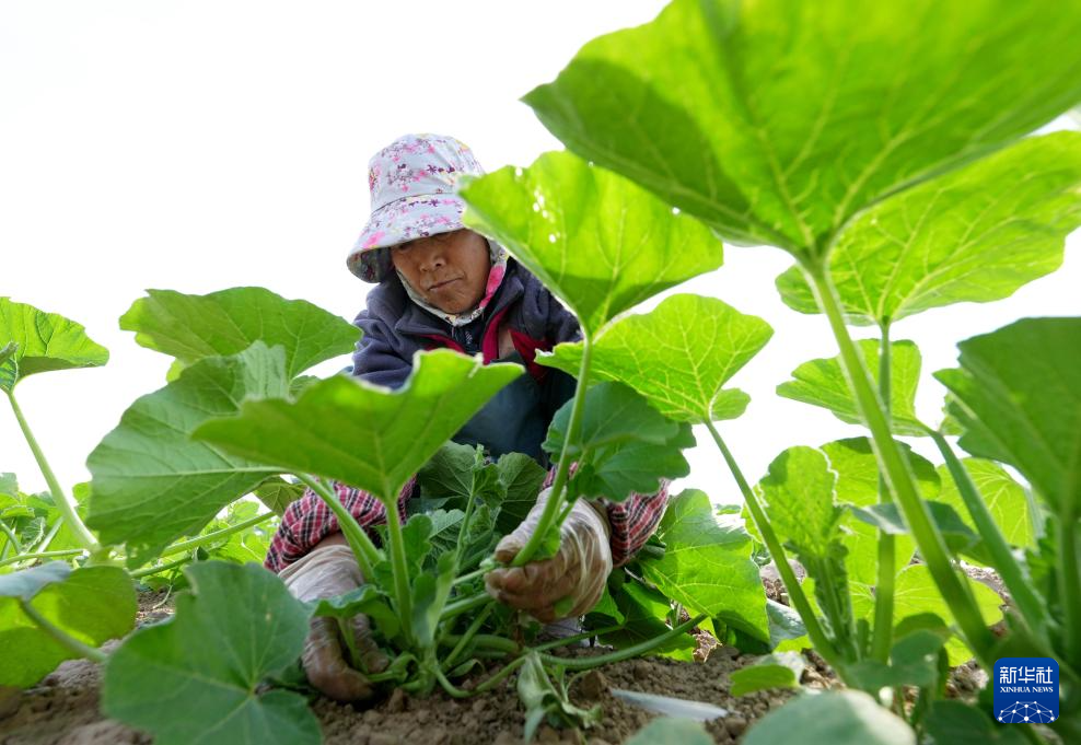 5月11日,河北省卢龙县卢龙镇一家生态农业合作社的社员在田间管护贝贝南瓜秧。
