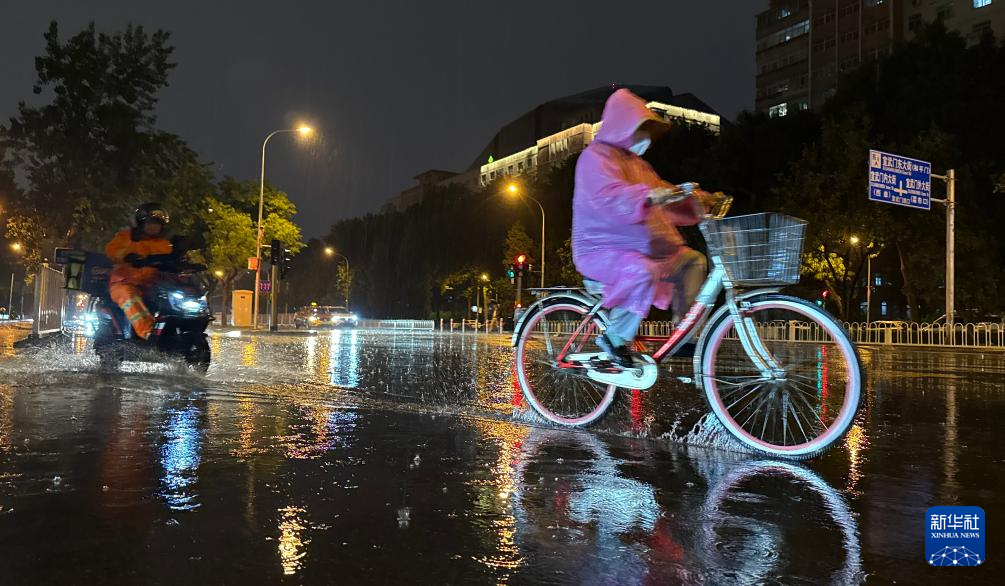 5月13日,市民在北京市西城区街头冒雨骑行。