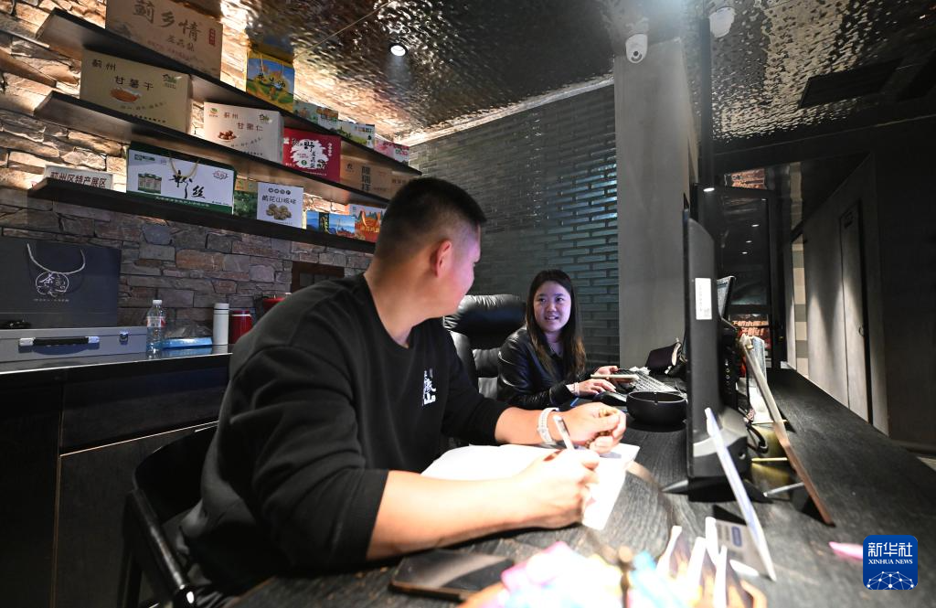 5月9日,在天津市蓟州区映像磐山古装摄影主题民宿,王若男(右)和同事在前台交流。