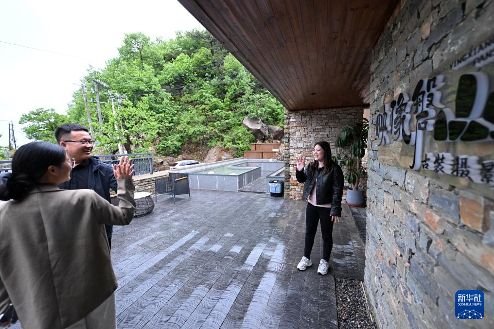5月9日,在天津市蓟州区映像磐山古装摄影主题民宿,王若男(右)和退房的客人告别。