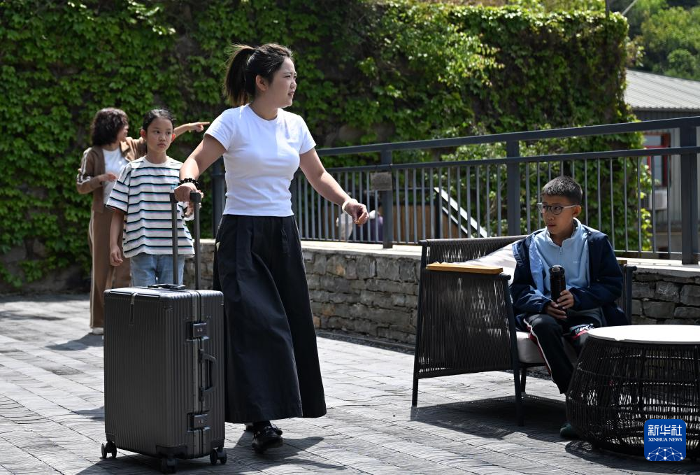 5月10日,在天津市蓟州区映像磐山古装摄影主题民宿,王若男(右二)帮抵达的客人搬运行李。