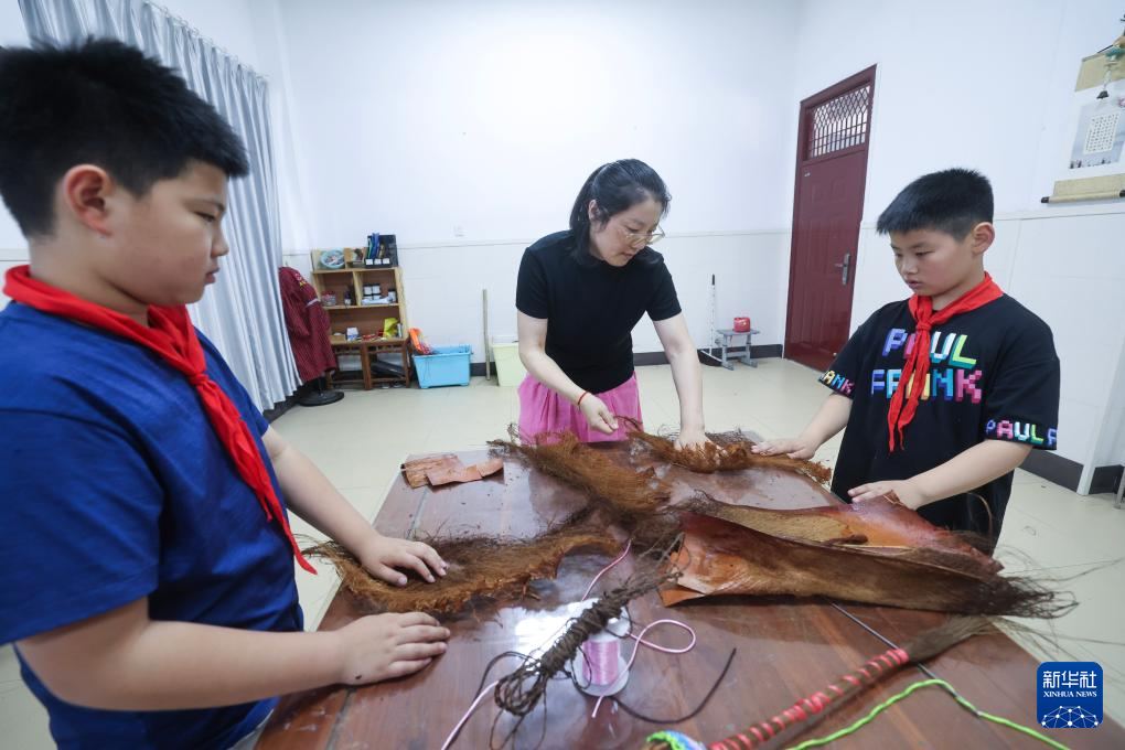 5月13日,陶朱街道中心学校西湖小学的学生在学习棕编。