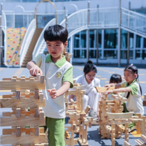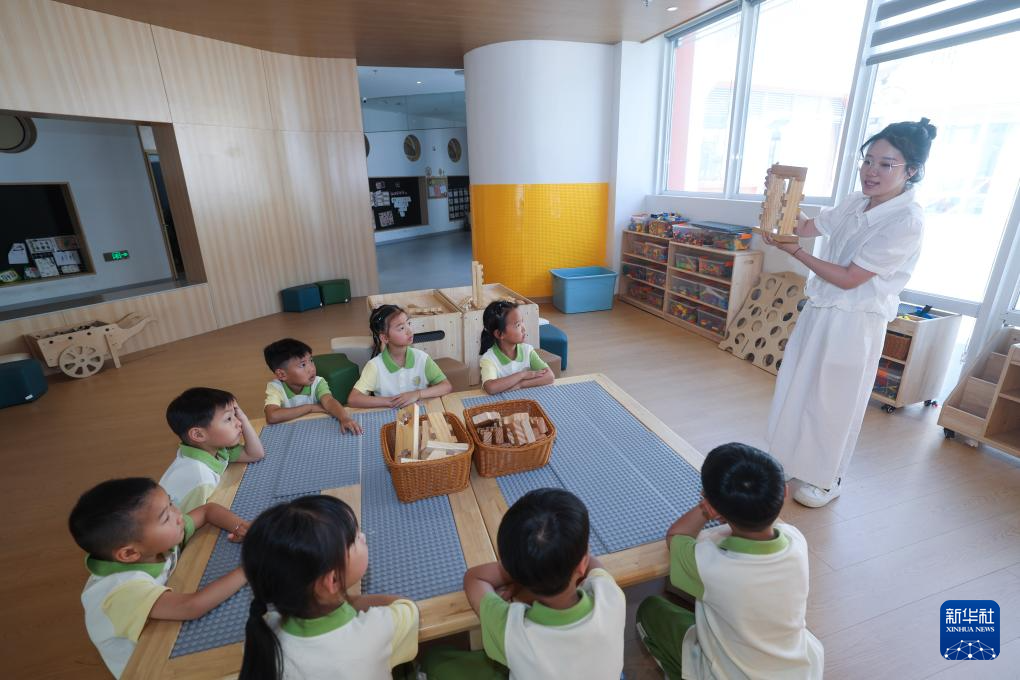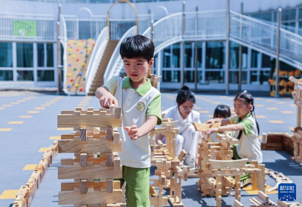 5月13日,陶朱街道中心学校尚学幼儿园的孩子们在老师的带领下用榫卯积木搭房子。