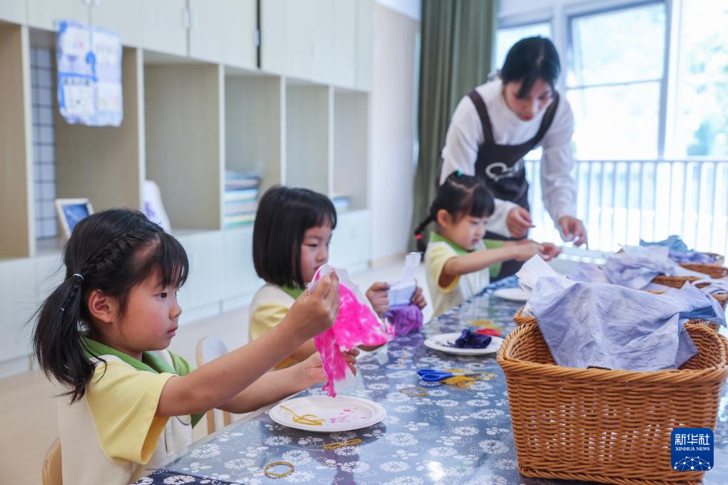 5月13日,陶朱街道中心学校尚学幼儿园的孩子们在上扎染课。