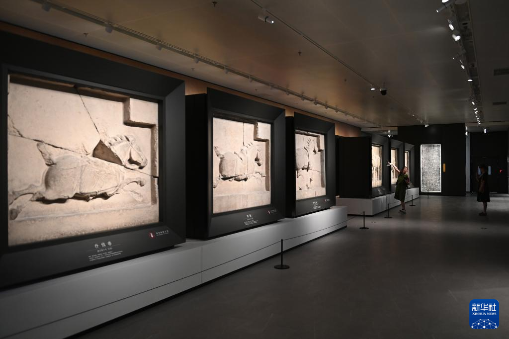 5月12日,游客在改扩建后的西安碑林博物馆北区场馆参观昭陵六骏石雕。