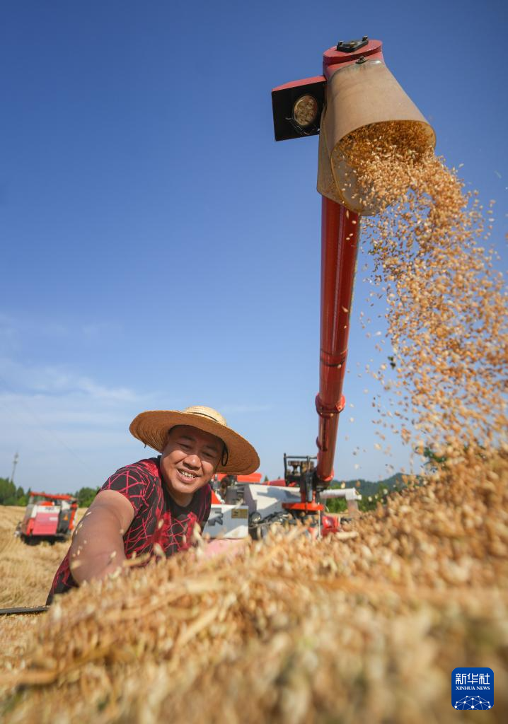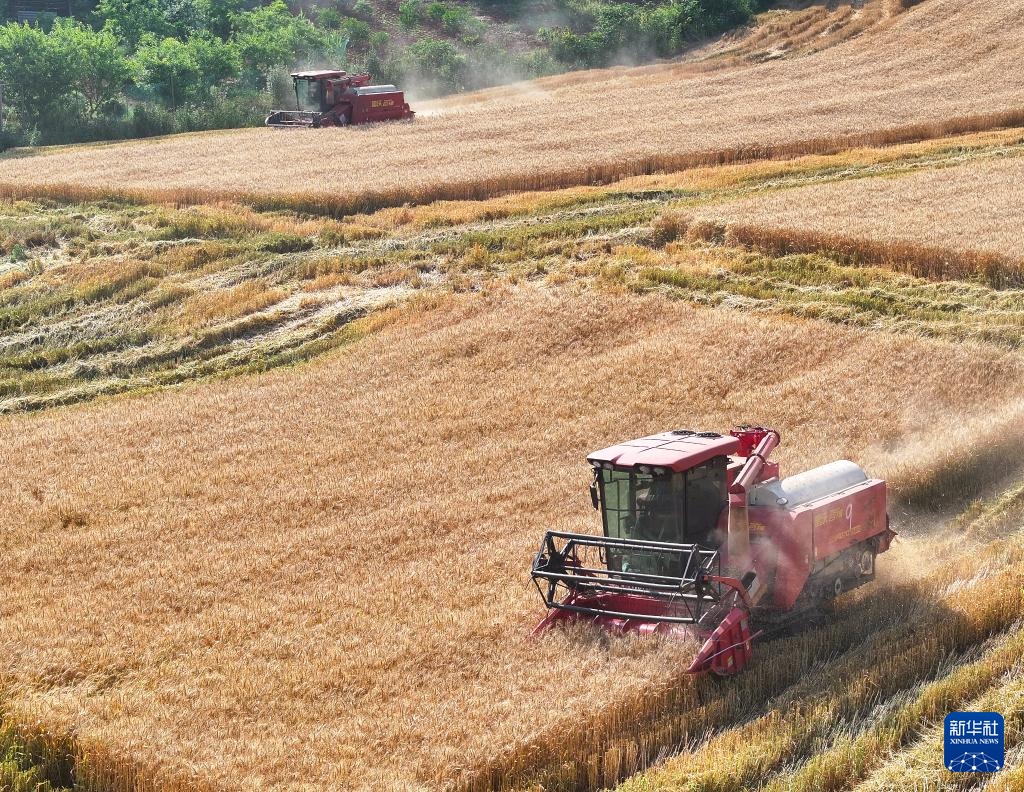 5月12日,农户在四川省射洪市沱牌镇桃花村收割小麦。