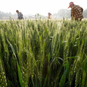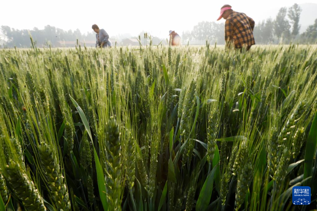 5月13日,农民在河北省遵化市东新庄镇的麦田锄草。