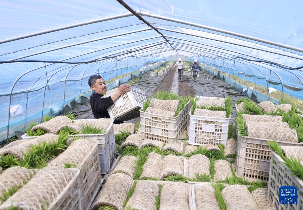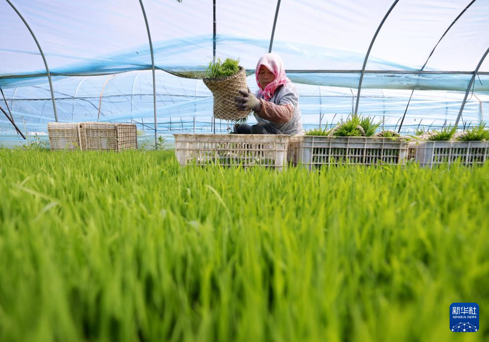 5月13日,河北省唐山市丰南区岔河镇一水稻种植合作社的社员在水稻育苗棚内起秧苗。