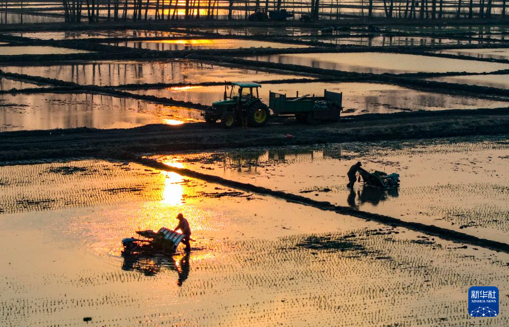 5月12日,在北大荒集团黑龙江八五六农场有限公司一处水田,搭载着北斗导航系统的水稻插秧机在插秧。