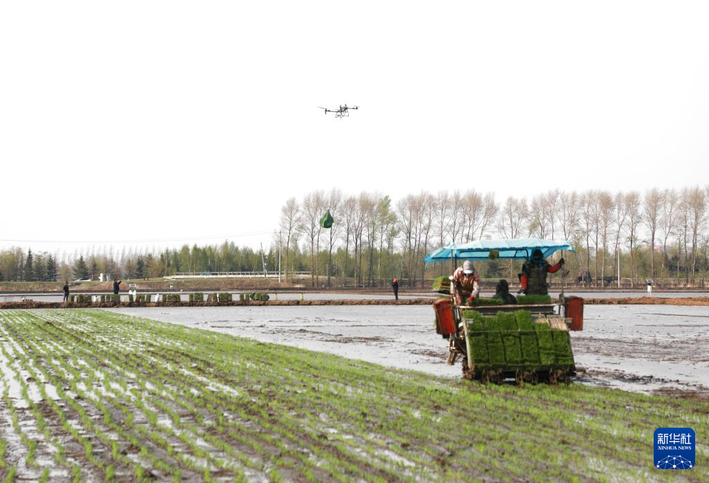 5月11日,在北大荒集团黑龙江七星农场有限公司第六管理区的水稻田内,无人机给插秧机运送秧苗。