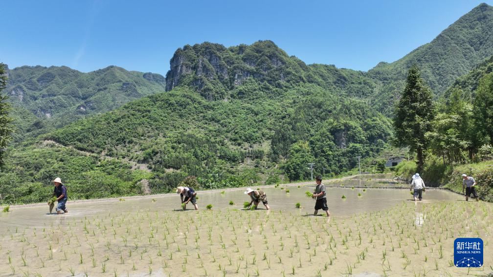 5月12日,重庆市酉阳土家族苗族自治县楠木乡红庄村村民在高山梯田插秧(无人机照片)。