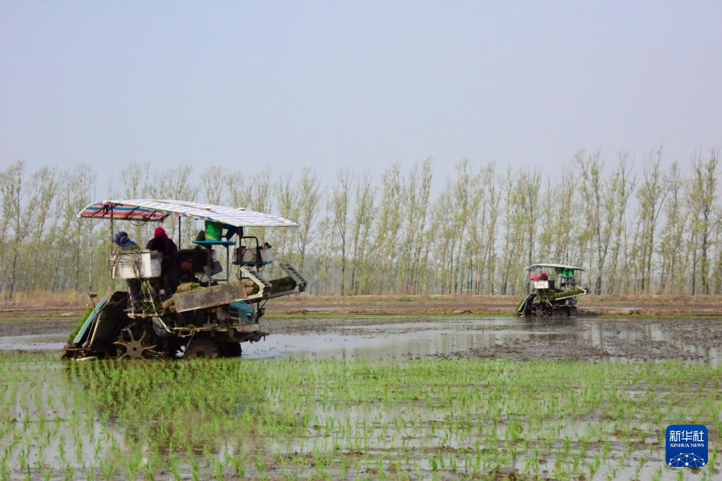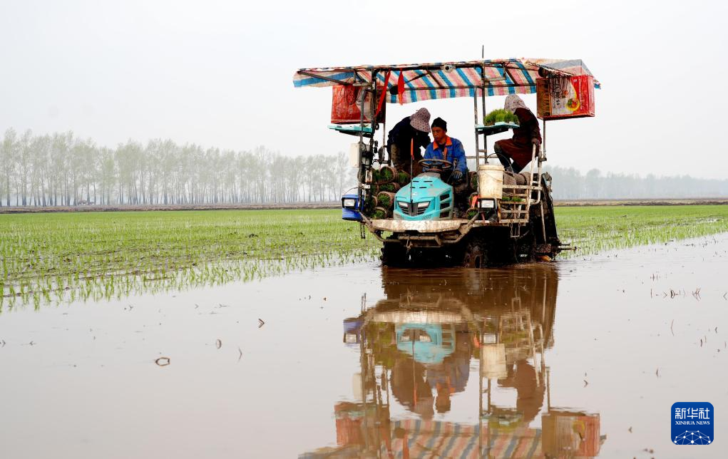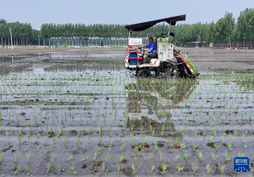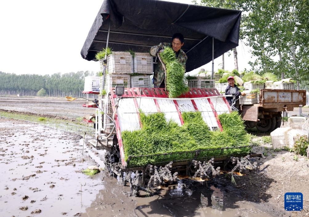 5月13日,河北省唐山市丰南区岔河镇一水稻种植合作社的社员在田间驾驶农机进行水稻插秧作业。