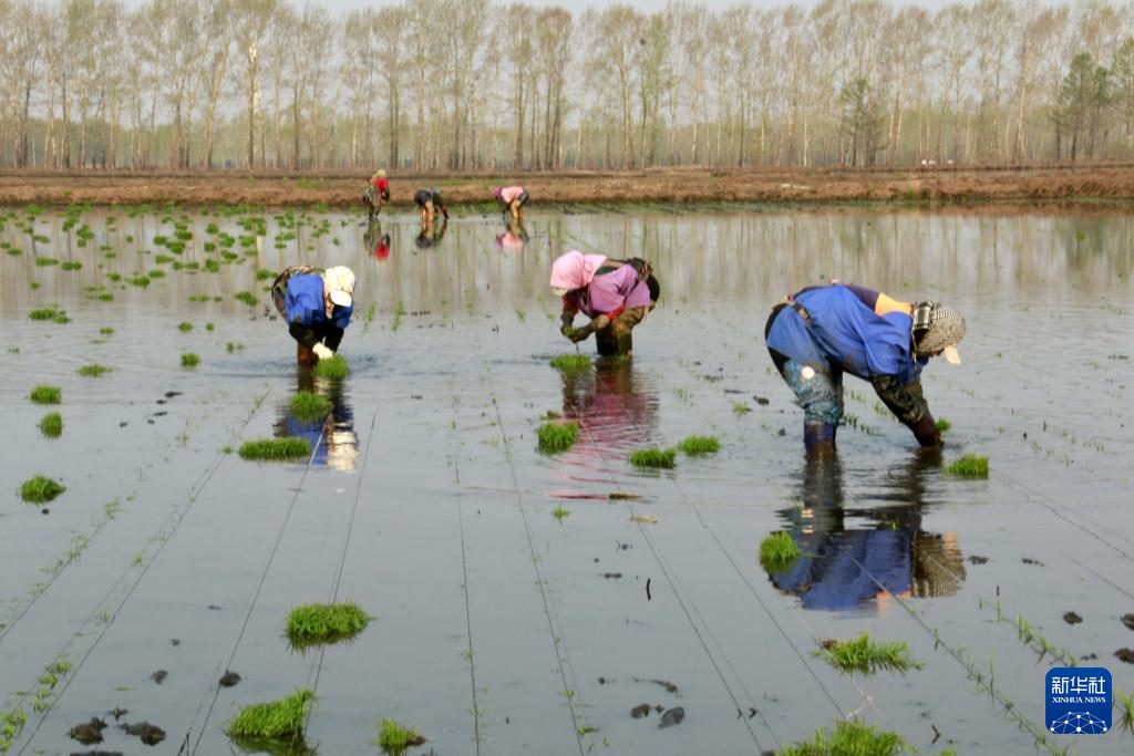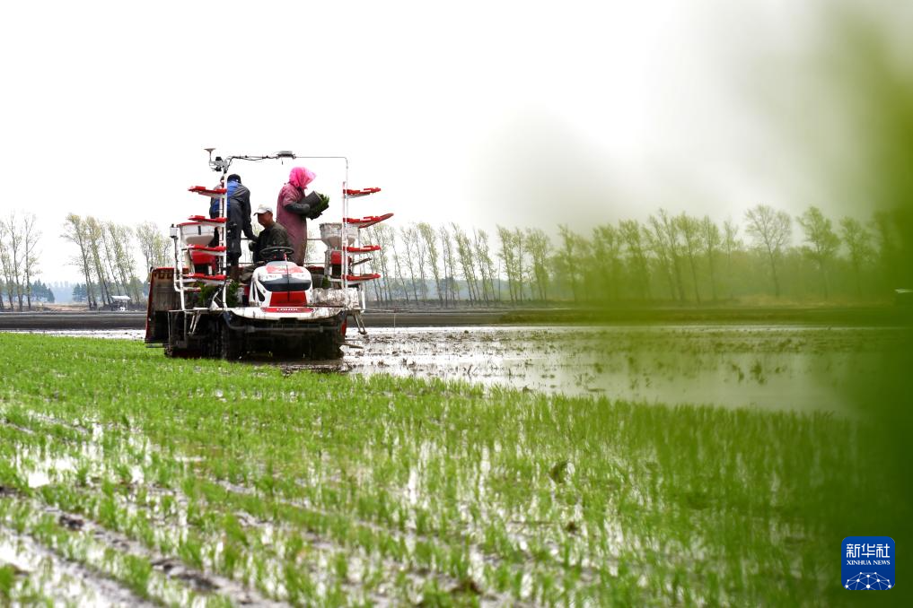 5月13日,在北大荒集团黑龙江绥滨农场有限公司东井管理区水田地里,农机驾驶员驾驶装有北斗卫星导航辅助直行系统的高速插秧机进行插秧作业。