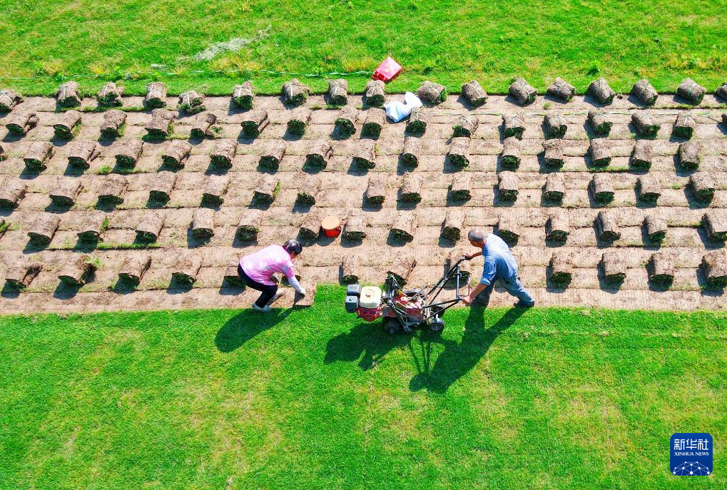 5月11日,村民在江苏省如皋市如城街道钱长村草坪种植基地铲收草皮(无人机照片)。