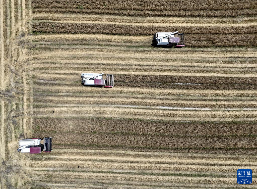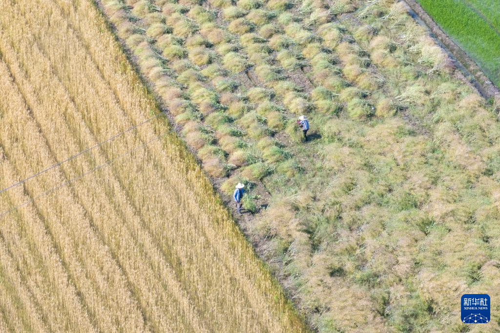 5月11日,河南省焦作市温县温泉街道东梁所村村民在田间采收油菜(无人机照片)。