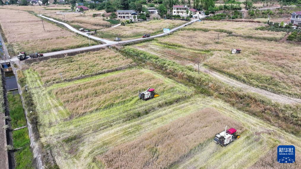 5月12日,在四川省阆中市柏垭粮油现代农业产业园区内,农机手驾驶收割机收获油菜(无人机照片)。