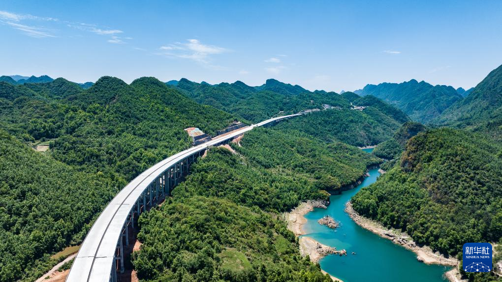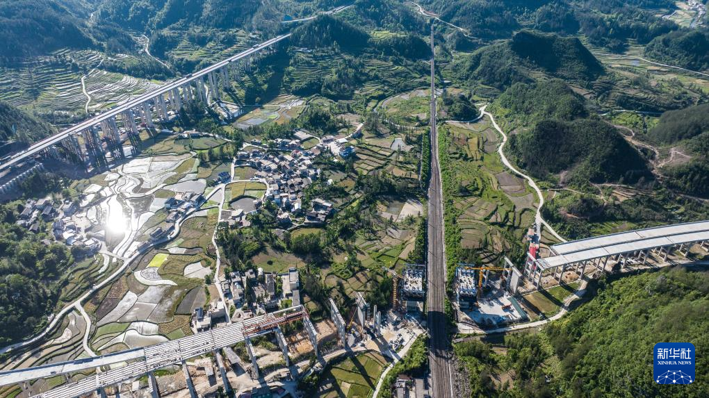 建设中的贵平高速底至特大桥(右下,跨越铁路线)(5月12日摄,无人机照片)。