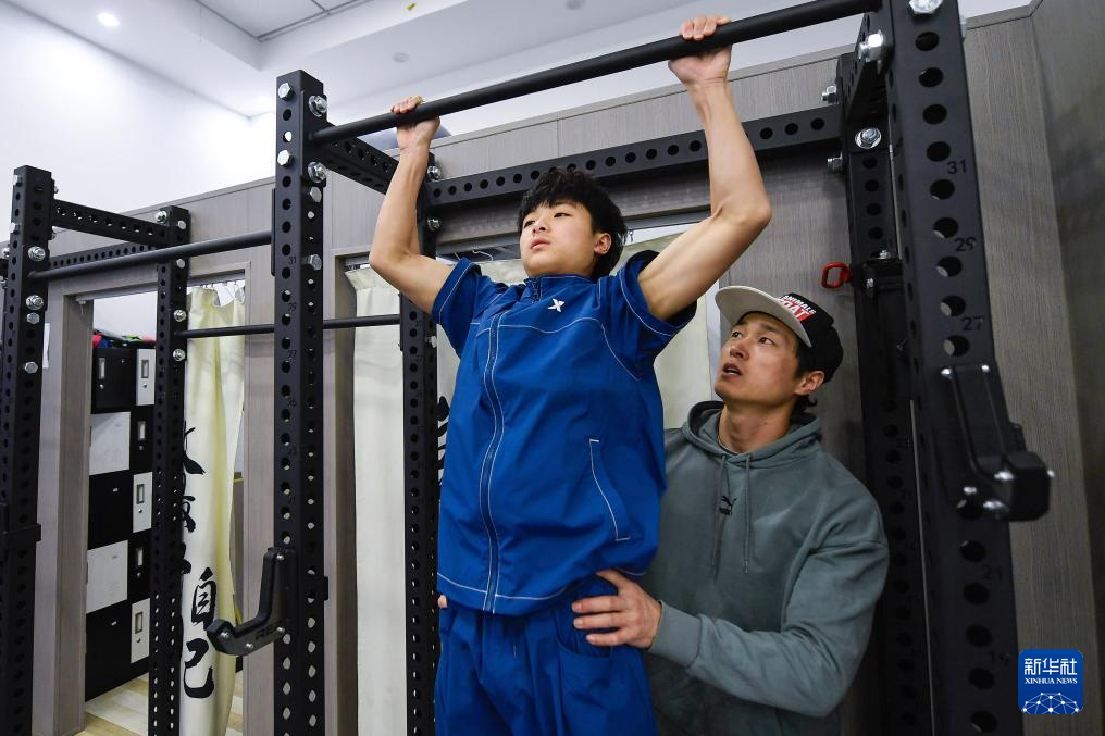图为崔圣雨(左)在教练任义指导下进行力量训练(5月7日摄)。