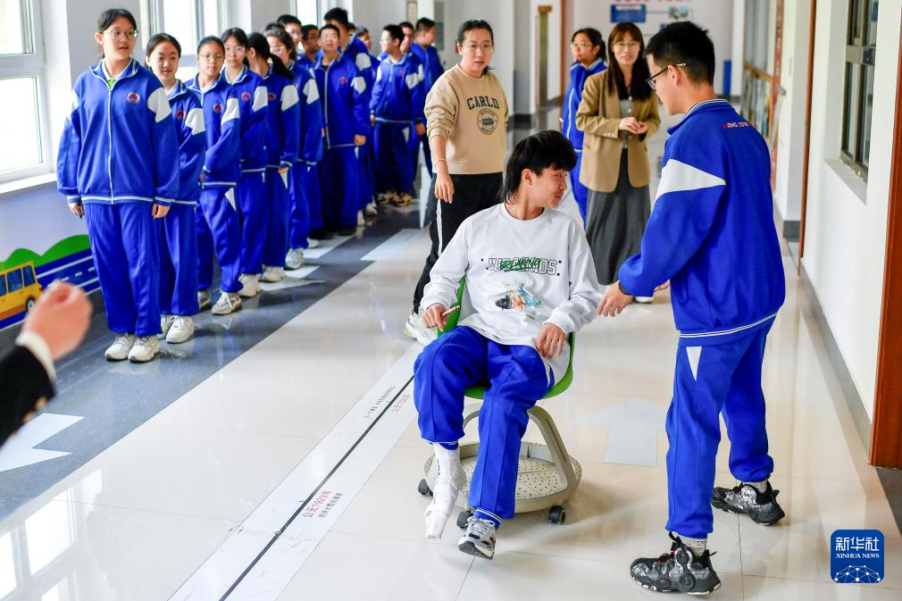 图为同学帮助意外受伤的崔圣雨在教学楼内移动(5月12日摄)。