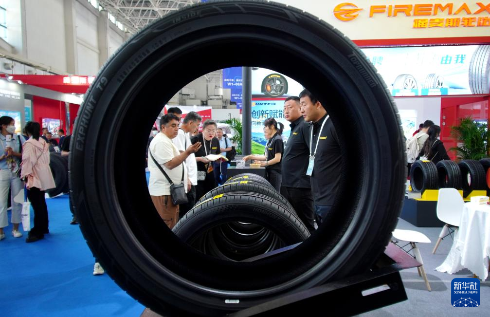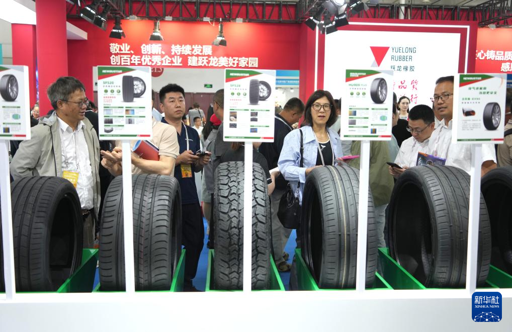 5月15日,人们在第十五届中国(广饶)国际橡胶轮胎暨汽车配件展览会上参观。