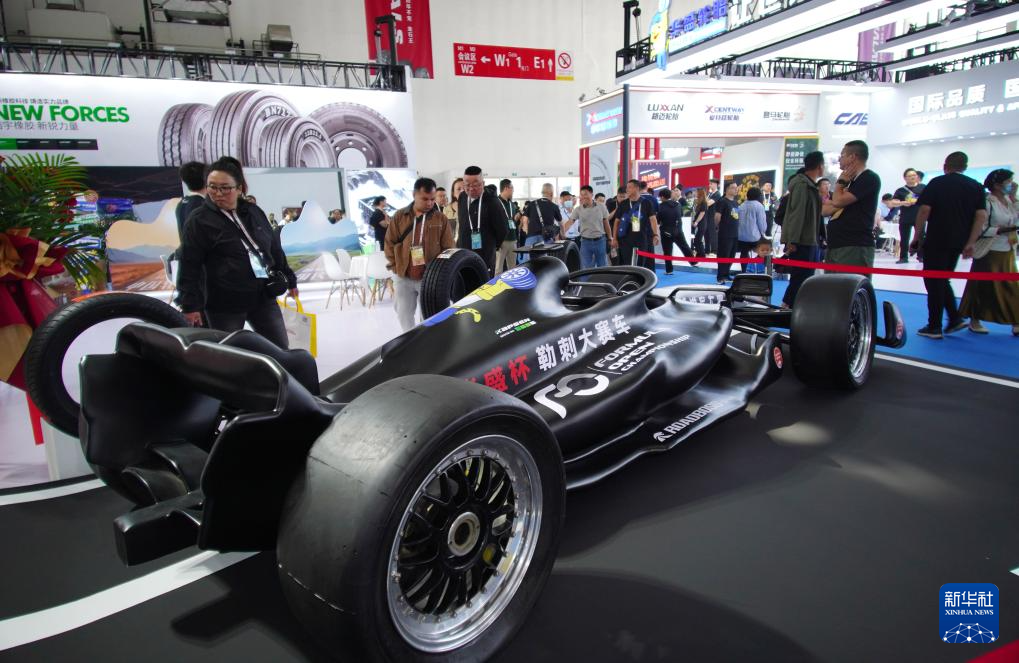 5月15日,在第十五届中国(广饶)国际橡胶轮胎暨汽车配件展览会上,一家参展商展出运用在赛车上的轮胎产品。