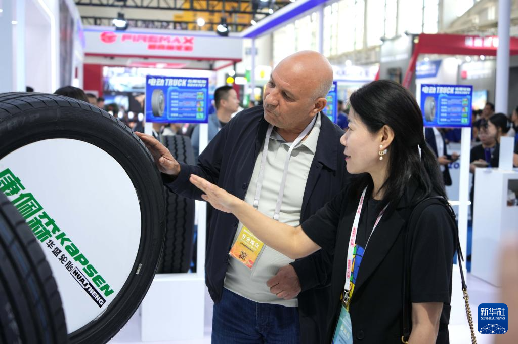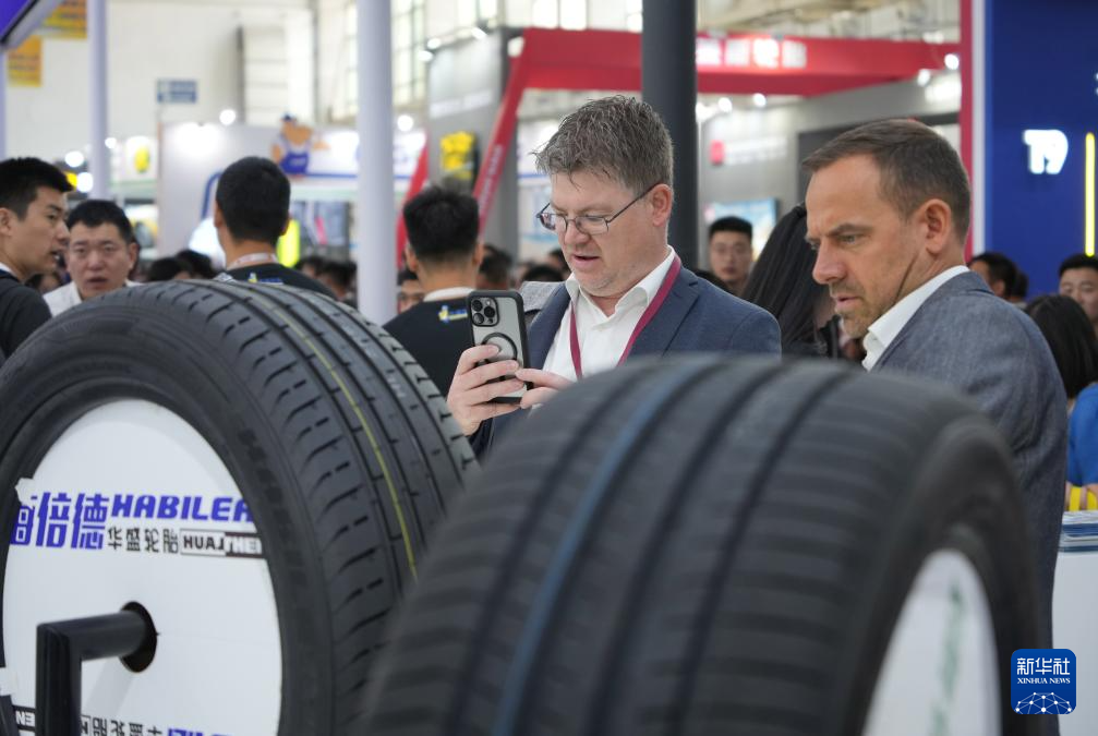 5月15日,在第十五届中国(广饶)国际橡胶轮胎暨汽车配件展览会上,一名来自境外的参观者(左)在查看轮胎产品。