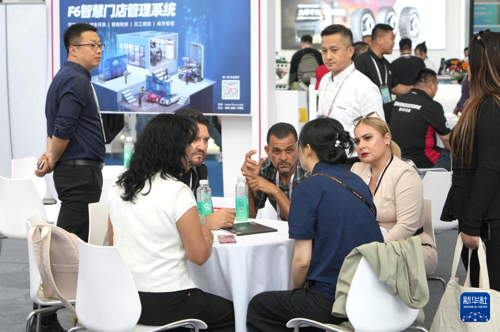 5月15日,在第十五届中国(广饶)国际橡胶轮胎暨汽车配件展览会上,几名来自境外的参观者与参展商交流。