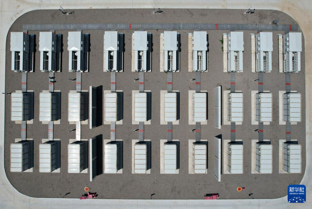 5月15日,国网故城县供电公司的工人在辖区军屯镇牛庄村附近的储能电站巡检(无人机照片)。