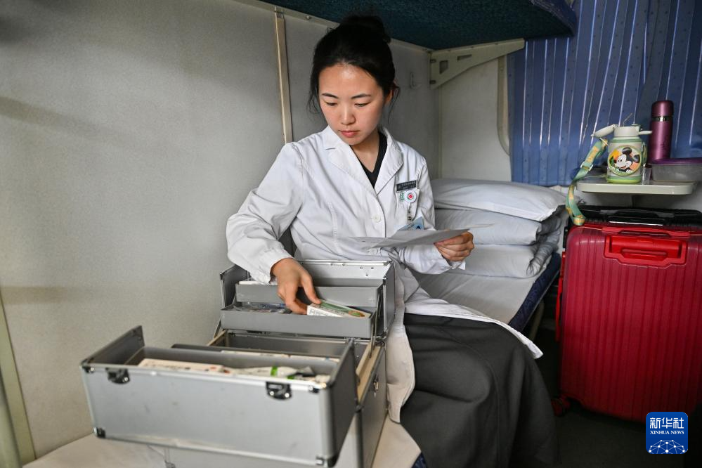 5月16日,“心连心·京藏号”2025年旅游列车上的跟团医生徐欣悦再次核对药品。