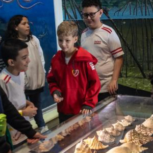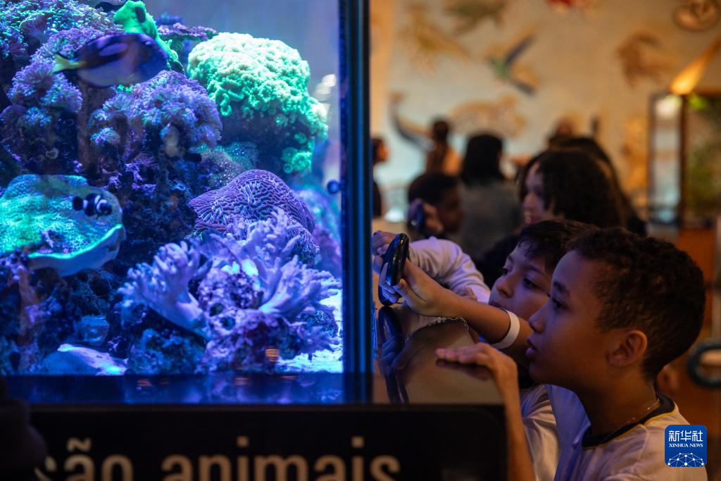 5月15日,在巴西圣保罗的卡塔文图博物馆,儿童在一处展区近距离观察珊瑚和热带鱼类。
