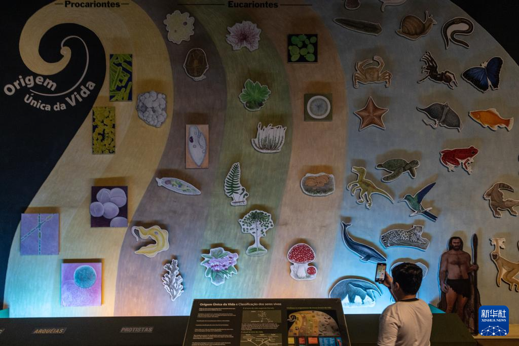 5月15日,在巴西圣保罗的卡塔文图博物馆,学生在一面展示墙前了解生命起源与物种演化。