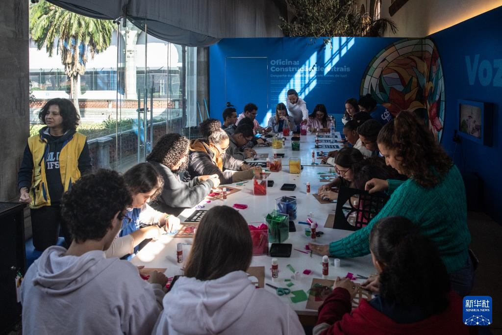 5月15日,在巴西圣保罗的卡塔文图博物馆,学生参与彩绘玻璃创意手工活动。