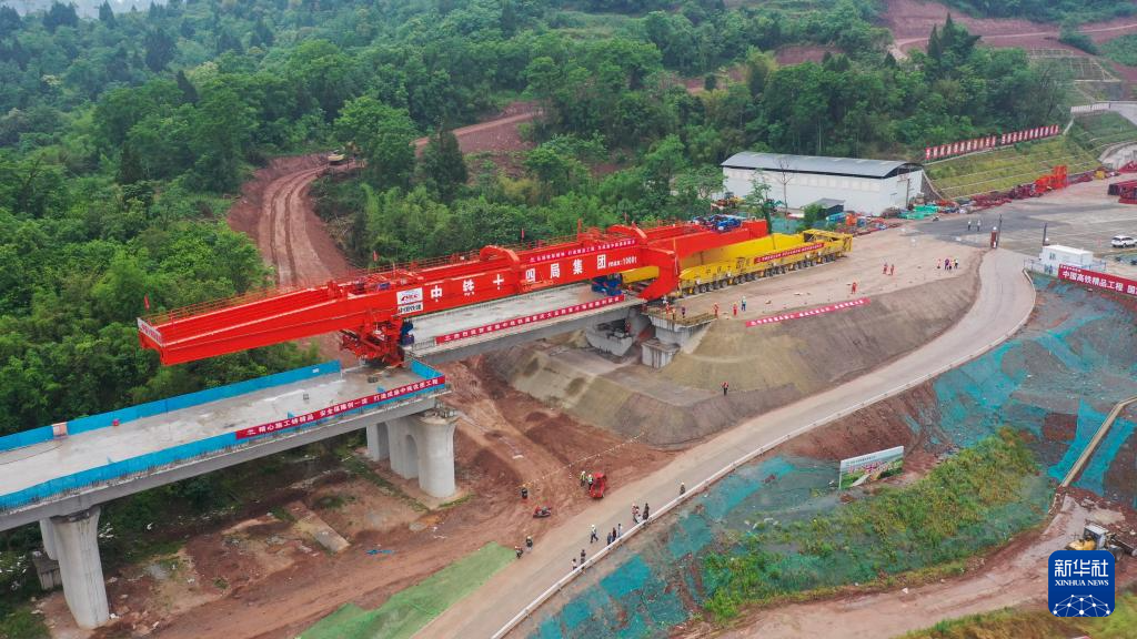5月16日,重庆市大足区,工作人员在现场进行首片双线箱梁的安装工作。
