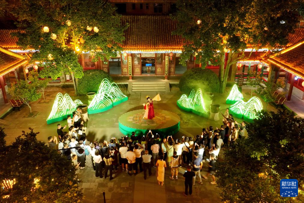 5月14日,游客在河北省正定县荣国府景区观看《一梦入红楼》实景演出(无人机照片)。