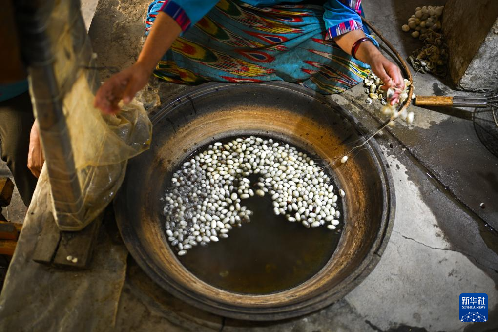 5月13日,在和田吉亚乡一处艾德莱斯绸手工作坊里,苏杜尔汗·阿不都热合木将蚕茧煮沸抽丝。