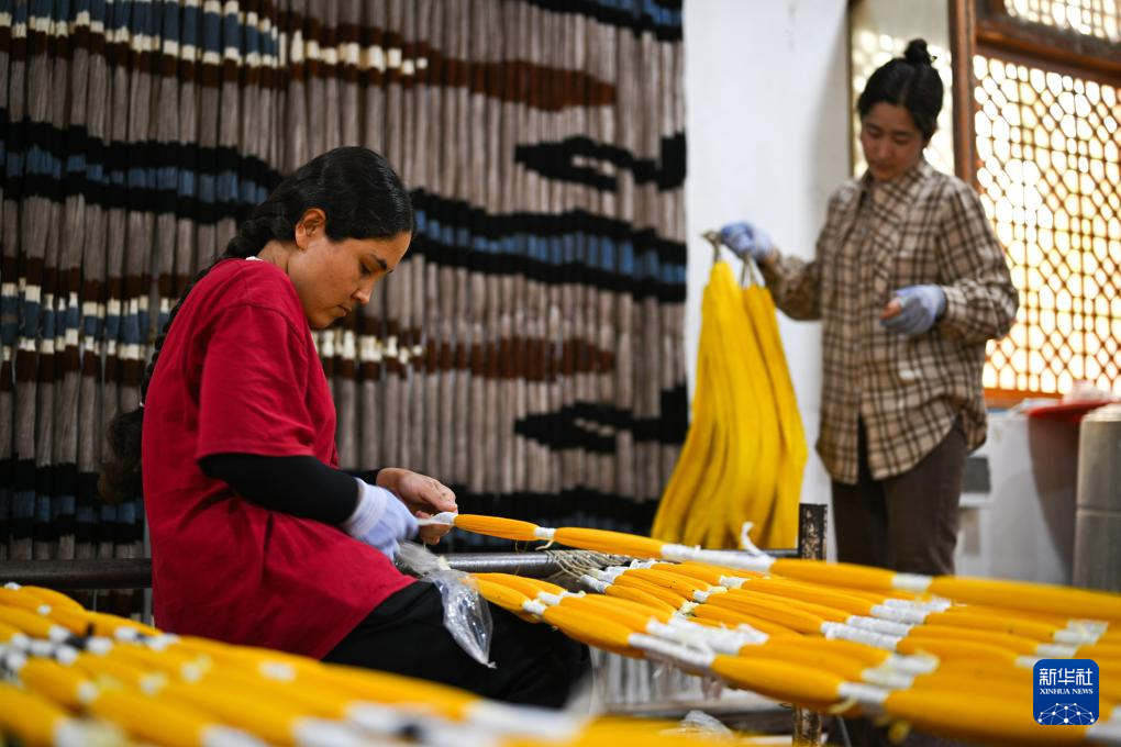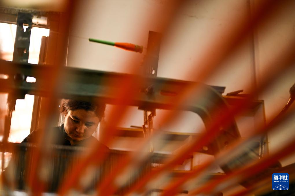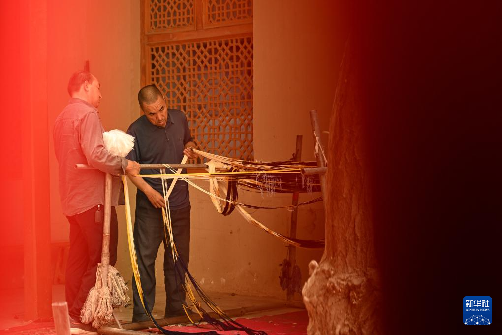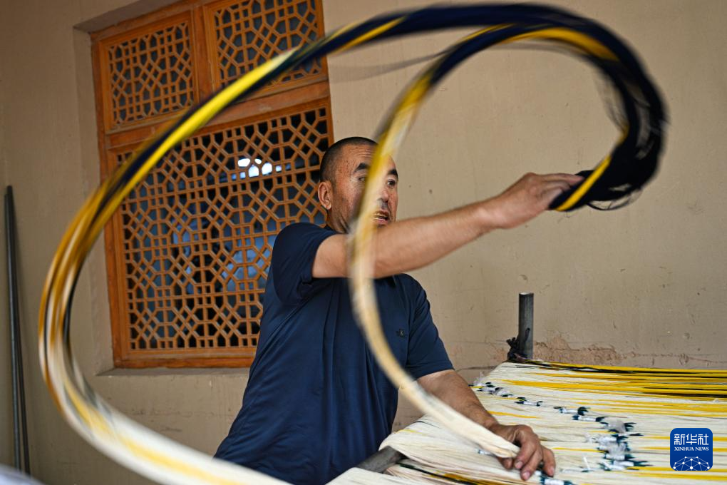 5月13日,在和田吉亚乡一处艾德莱斯绸手工作坊里,工人在整理丝线、排布图案,准备织造艾德莱斯绸。