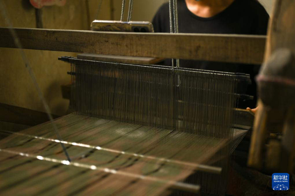 5月13日,在和田吉亚乡一处艾德莱斯绸手工作坊里,工人在使用传统木制织布机织造艾德莱斯绸。