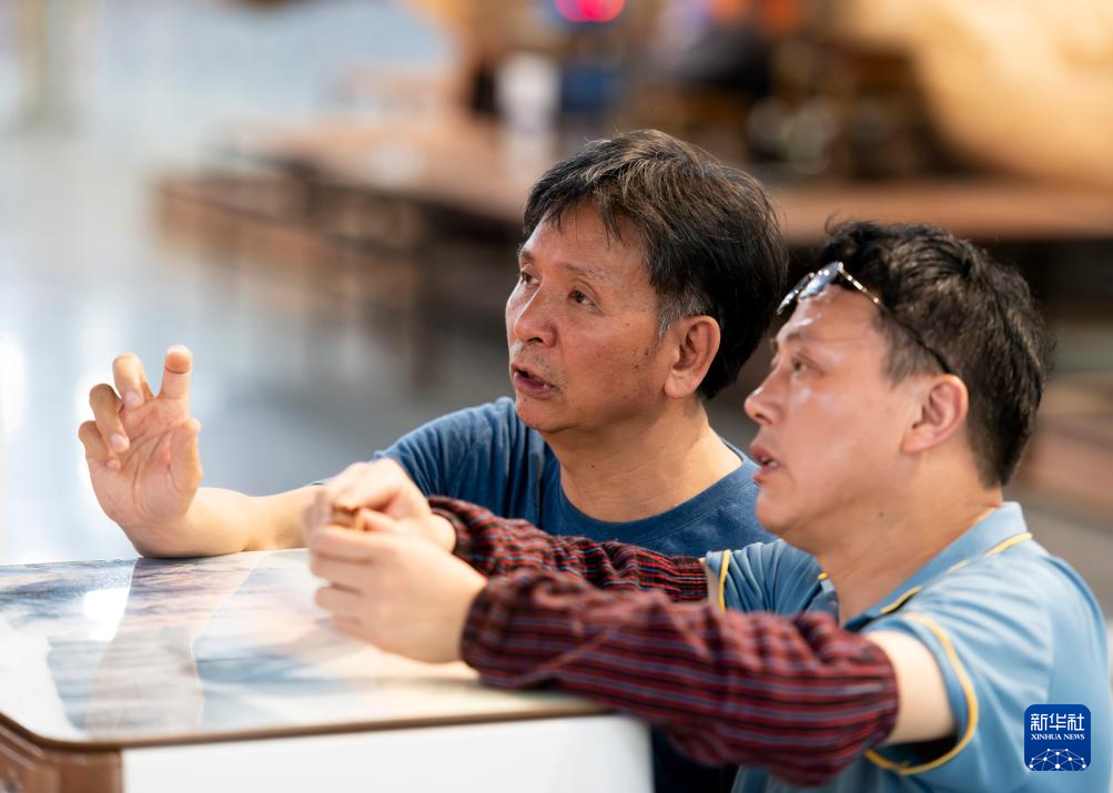 在莆田美术馆,郑春辉(左)在教授徒弟雕刻技巧(5月16日摄)。