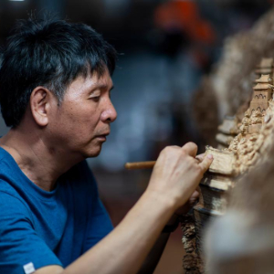 郑春辉,国家级非遗项目莆田木雕代表性传承人。1985年起从事木雕工作至今,几十年如一日,用刻刀在木头上书写历史。凭借精湛的技艺与诗意的表达,他有100多件作品荣获国家级、省部级美展金奖,多件作品被中国国家美术馆、中国工艺美术馆、中国木雕艺术馆等收藏。2013年,郑春辉创作大型木雕作品《清明上河图》,长达12.286米。