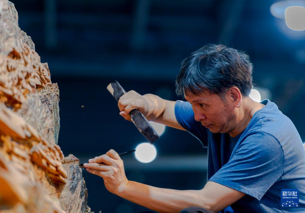 郑春辉在莆田美术馆进行雕刻创作(5月16日摄)。