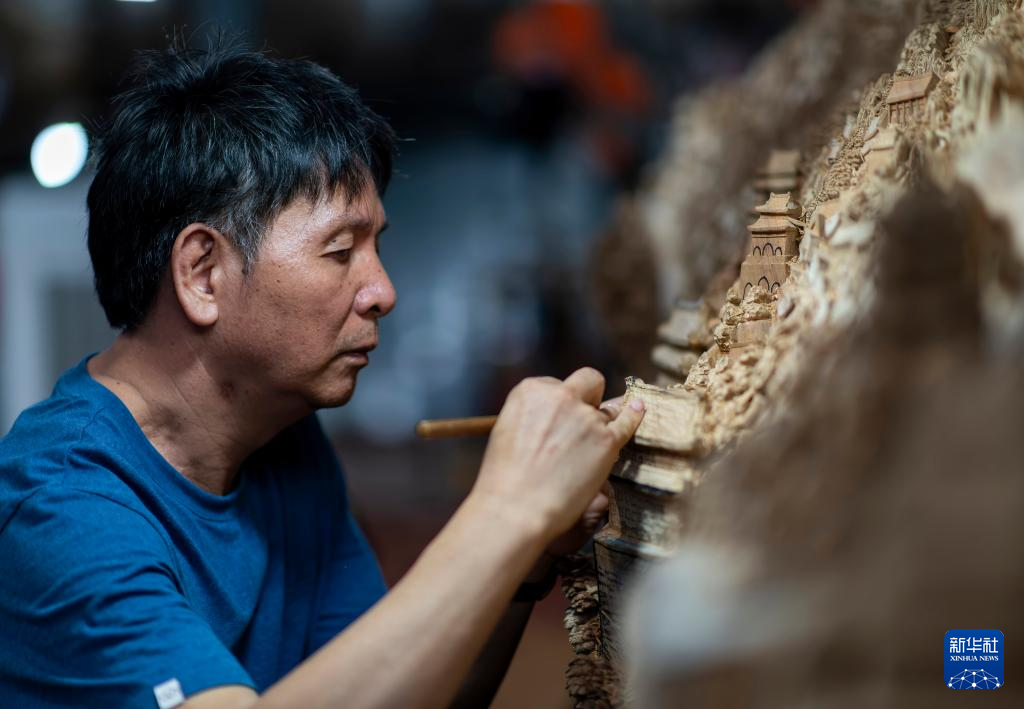 在莆田美术馆,郑春辉在构思百米巨型木雕作品《京杭大运河》的下一步雕刻工序(5月16日摄)。