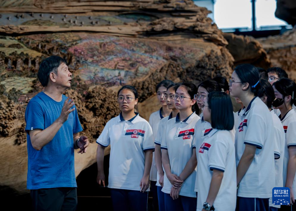 在莆田美术馆,郑春辉(左一)在向参加研学活动的中学生们介绍百米巨型木雕作品《京杭大运河》的创作心得(5月16日摄)。