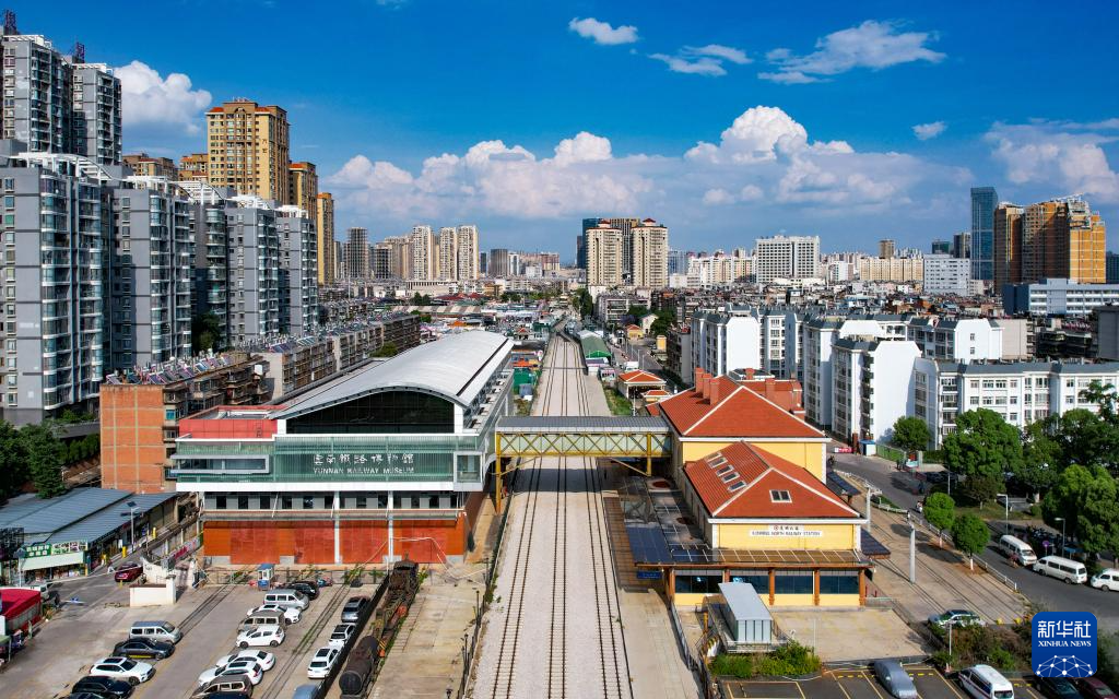这是5月14日拍摄的云南铁路博物馆,南馆北馆通过廊桥贯通跨越昆明北火车站股道(无人机照片)。